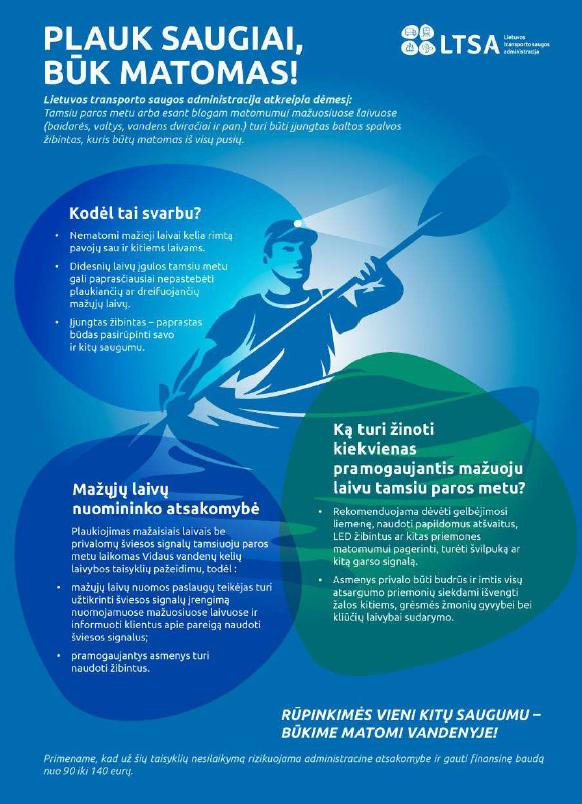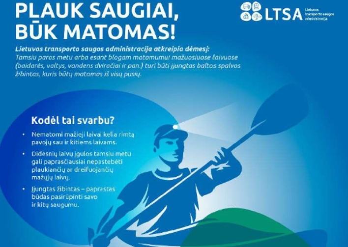 Lietuvos transporto saugos administracijos Vandens transporto departamentas reaguodamas į pranešimus dėl tamsiuoju paros metu vidaus vandenų keliais (laivakeliu) plaukiojančių mažųjų laivų (pvz., baidarių, valčių, kanojų), kurie neturi jokių šviesos signalų, pažymi, kad toks elgesys kelia grėsmę ne tik asmenims, plaukiantiems šiomis vandens transporto priemonėmis, bet ir kitų laivybos dalyvių saugumui.