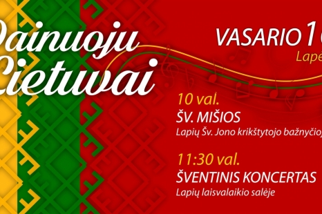 10:00 Šv. mišios Lapių Šv. Jono krikštytojo bažnyčioje 11:30 Šventinis koncertas Lapių laisvalaikio salėje Dainas Lietuvai dovanos Pocket Opera Kaunas:...
