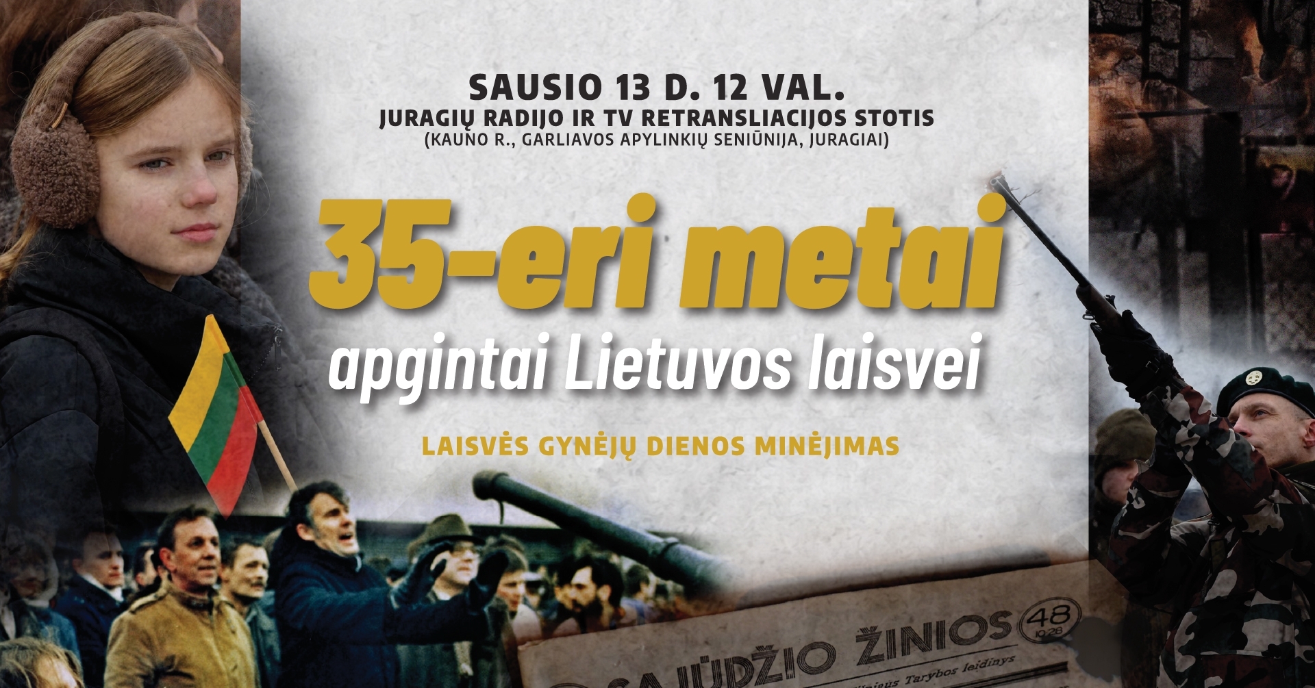 2026-01-13 12:00 2026-01-13 12:00 Europe/Vilnius „35-eri metai apgintai Lietuvos laisvei“ Laisvės gynėjų dienos minėjimas „35-eri metai apgintai Lietuvos laisvei“ Sausio 13-oji – diena, kai tylos ir vienybės galia apgynė Lietuvos laisvę. Kviečiame kartu pagerbti Laisvės gynėjus ir prisiminti lemtingus 1991-ųjų sausio įvykius. Renginio programa: • Pagarbos salvės • Prisiminimai ir... --- //www.kaunorajonas.lt/renginys/35-eri-metai-apgintai-lietuvos-laisvei/date-20260113 Juragių radijo ir TV stotis, Kauno rajone Garliavos kultūros centras [email protected]