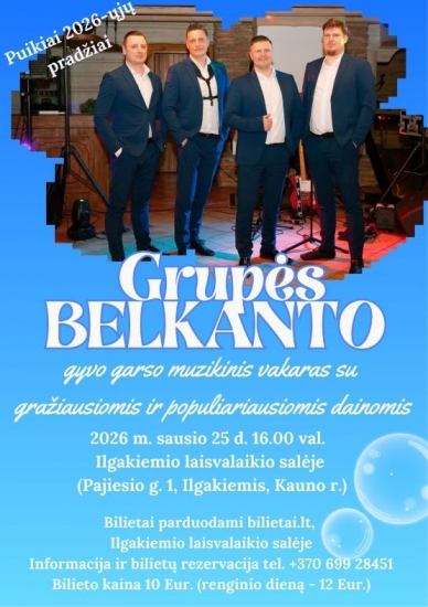 https://www.bilietai.lt/.../grupes-belkanto-gyvo.../... ir Ilgakiemio laisvalaikio salėje iki pat renginio pradžios. Visi esate labai laukiami!"