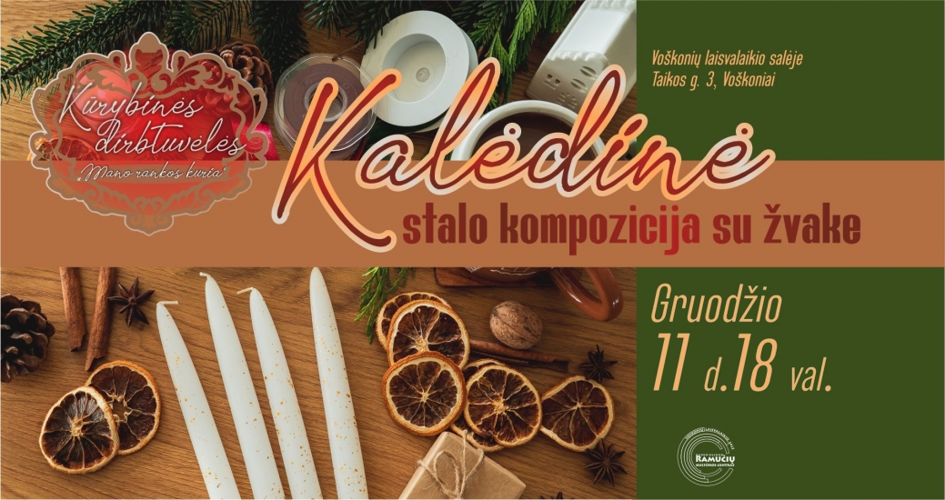 2025-12-11 18:002025-12-11 18:00Europe/VilniusKūrybinės dirbtuvės „Kalėdinė stalo kompozicija su žvake“ Ramučių kultūros centro dailininkės padedami sukursime stalo kompoziciją. Pasipuoškime namus šventiškai ir jaukiai laukime gražiausių metų švenčių.