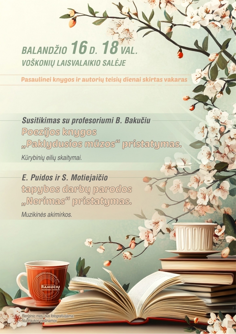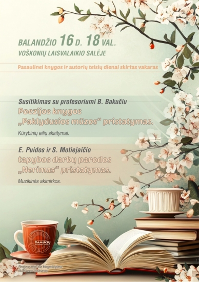 2026-04-16 18:002026-04-16 18:00Europe/VilniusLiteratūrinis vakaras Voškonių laisvalaikio salėje Pasaulinei knygos ir autorių teisių dienai paminėti literatūrinis vakaras Voškonių laisvalaikio salėje!
