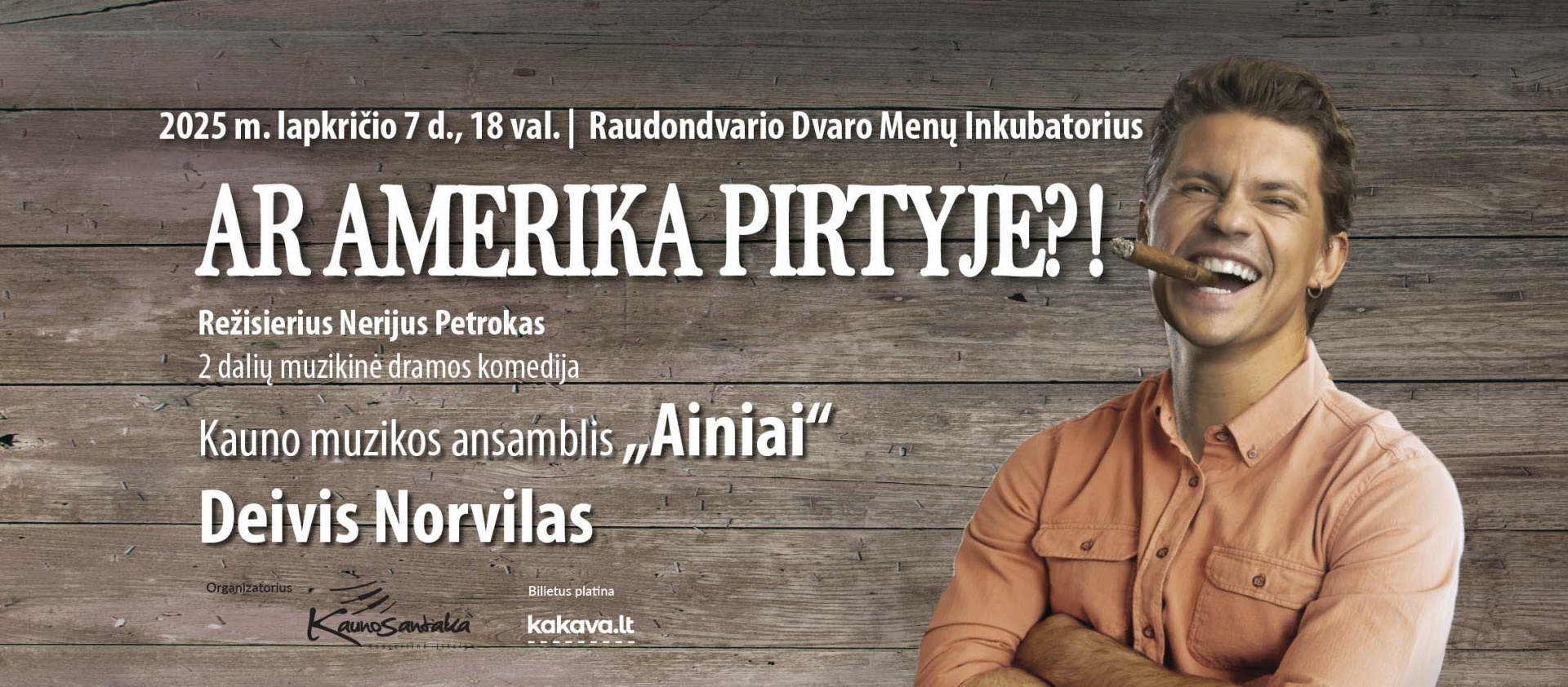 Nusibodo banalybės, pigūs anekdotai, muilo operų siužetai ir kompiuteriu kurta muzika?! Čia žiūrovai išvys nuoširdžią, TIKRĄ komediją. Ir nepaprastą – muzikinę! „AR AMERIKA PIRTYJE?!“ – tai muzika ir dainomis atgaivinta pirmoji lietuviška pjesė, su dideliu pasisekimu gastroliuojanti po Lietuvos miestų sales.