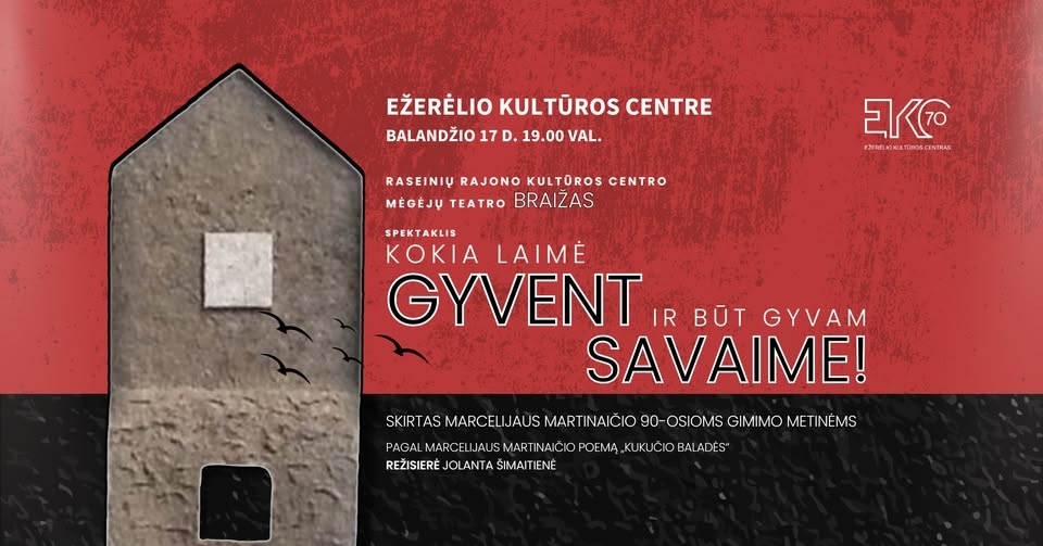 Raseinių kultūros centro mėgėjų teatras „Braižas“ kviečia į literatūrinį-muzikinį spektaklį „Kokia laimė gyvent ir būt gyvam savaime“, sukurtą pagal Marcelijaus Martinaičio poemą „Kukučio baladės“.