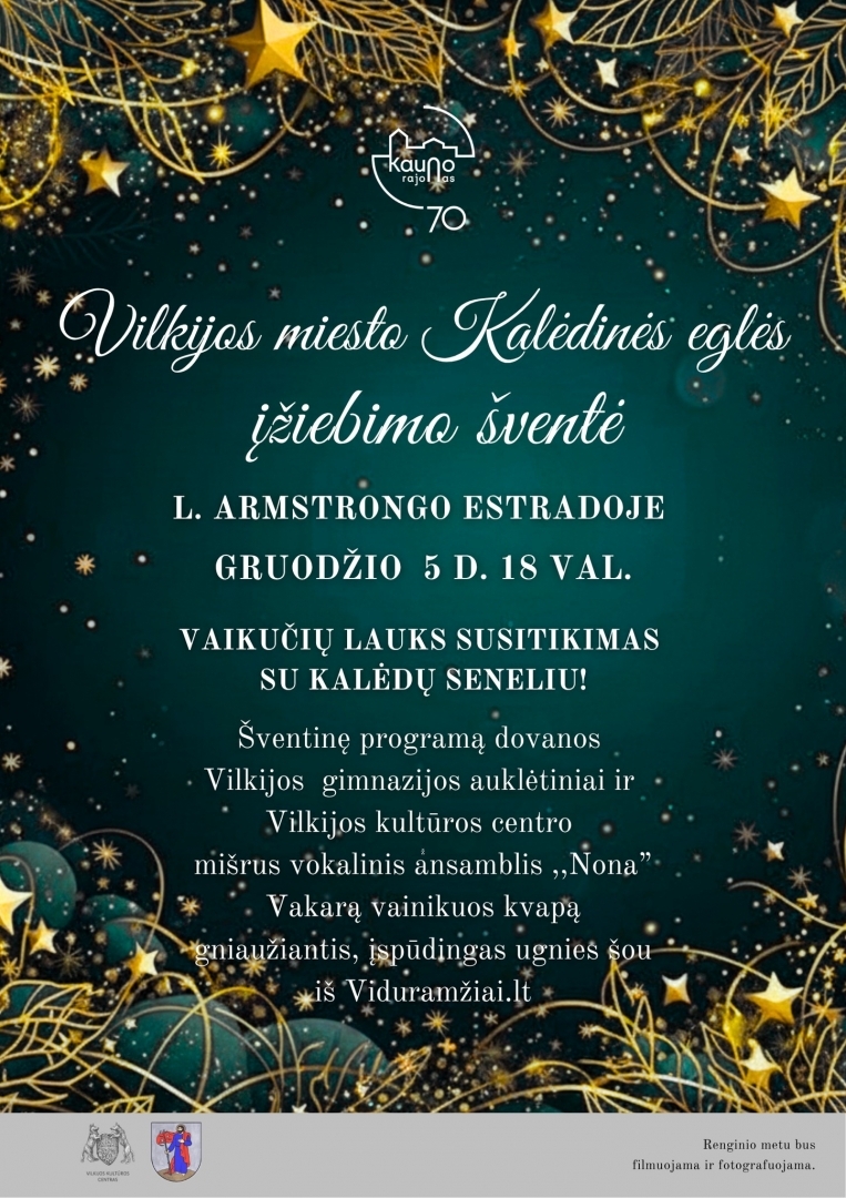 Visus kviečiame į Kalėdinės eglės įžiebimo šventę! Laukia šiltas ir džiaugsmingas susitikimas su Kalėdų seneliu! Šventinę atmosferą kurs Vilkijos gimnazijos auklėtiniai ir Vilkijos kultūros centro mišrus vokalinis ansamblis „Nona“. Vakarą vainikuos kvapą gniaužiantis, įspūdingas ugnies šou iš Viduramžiai. lt. Ateikite pasimėgauti magiška žiemos nuotaika ir pasisemti šventinio įkvėpimo – šiluma ir džiaugsmu pasidalinsime kartu!